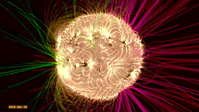 In diesem Video von der NASA erklärt Sonnenforscherin Holly Gilbert mit Hilfe eines herrlich dynamischen Computermodells die Magnetfelder der Sonne. Die rosafarbenen und grünen Linien sind offen in den Weltraum erstreckt, während ihre Gegenstücke, die weißen Linien geschlossen sind und zurück in Richtung der Oberfläche der Sonne gehen. Das Video zeigt die Entwicklung der Sonne von 2011 bis Mitte 2013 im Zeitraffer. Das Magnetfeld an sich ist für das menschliche Auge unsichtbar.