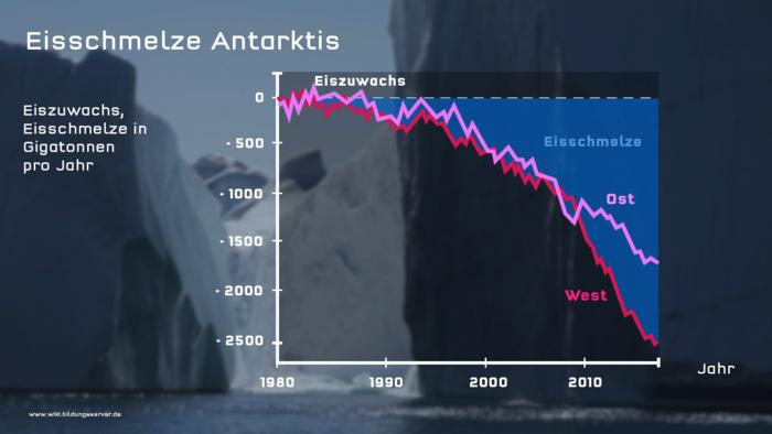 So hat laut Wissenschaftlern die gesamte Antarktis (West und Ost zusammen) seit 2009 jährlich fast 252 Milliarden Tonnen Eis verloren. Dies ist das Ergebnis einer Studie, die in der Fachzeitschrift "Proceedings of the National Academy of Sciences" (PNAS) veröffentlicht wurde. Warum das Eis in der Westantarktis schneller schmilzt als in der Ostantarktis wird noch erforscht. Das hat möglicherweise mit dem auf dem Meer schwimmenden Schelfeis zu tun.
