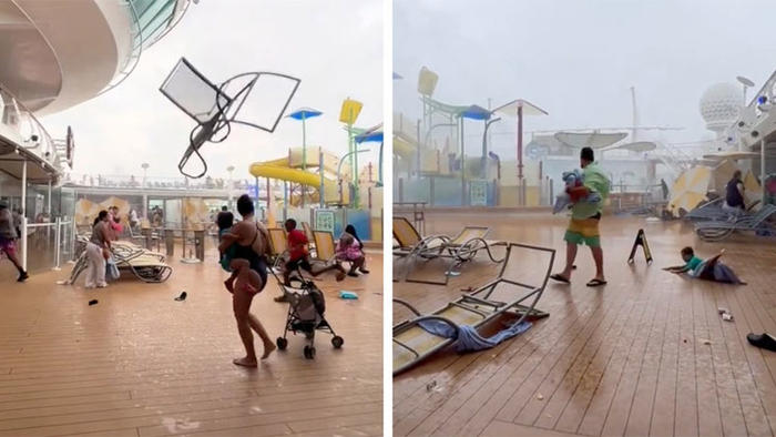 Auf dem Weg in die Karibik ist das Kreuzfahrtschiff „Independence of the Seas“ von einem heftigen Sturm erwischt worden. Auf dem Video ist zu sehen, wie das Mobiliar auf dem Deck durch die Gegend fliegt und Menschen verzweifelt versuchen in Sicherheit zu gelangen.