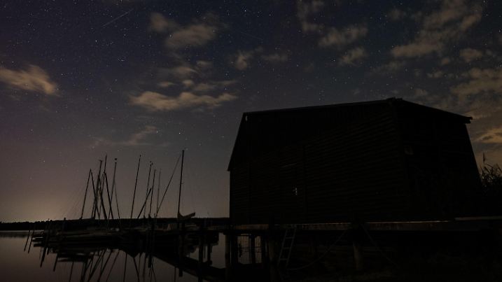 12.08.2024, Thüringen, Meuselwitz: Ein Perseidenmeteor zieht über den Himmel. In diesem Jahr erreicht der Meteorsturm seinen Zenit in der ersten August. Foto: Hannes P. Albert/dpa +++ dpa-Bildfunk +++