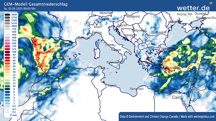 Zuerst einmal liegen die Schwerpunkte möglicher Unwetter durch Schwergewitter mit Hagel, Sturmböen und Starkregen in Portugal und Spanien sowie in der Südtürkei. Punktuell drohen bis zum Wochenende Regenmengen von 100 Litern je Quadratmeter oder mehr.