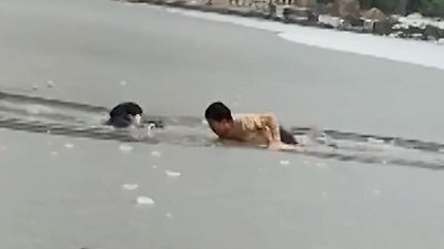 Drama auf dem Eis! Junge stürzt ein – dann kämpft sein Helfer ums Überleben