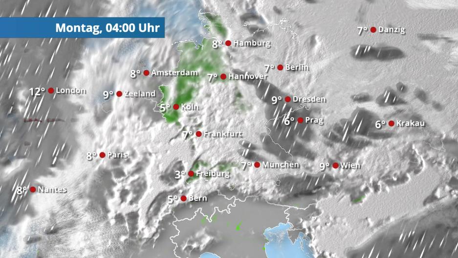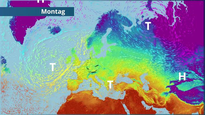 Ein Blick auf die Großwetterlage mit ihren großflächigen Luftströmungen hilft beim Verständnis des Wetterberichts. Wie ziehen die Tiefs, wie verlagern sich die Hochs? Und wie kräftig weht dazu der Wind? Die Entwicklung der Temperaturen in Deutschland und ganz Europa ist gut zu erkennen. Prognose vom 09. November 2025 um 12:00 Uhr