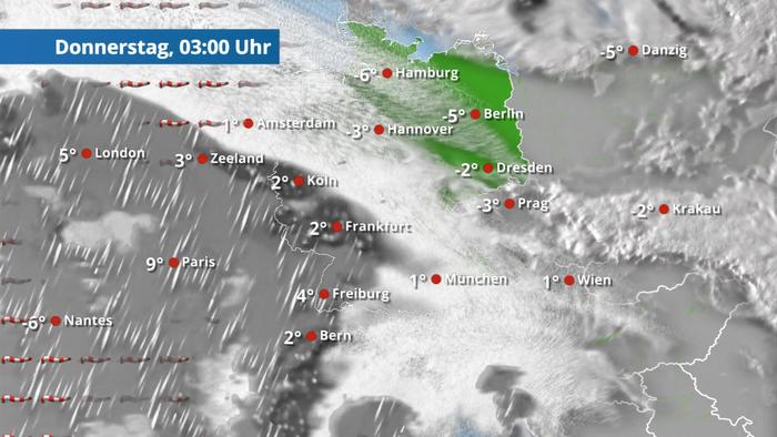 Wann regnet oder schneit es? Und wo regnet oder schneit es? Wie warm wird es? Diese Animation zeigt, wie Wolken, Schnee und Regen heute und morgen über Deutschland ziehen und wie hoch die Temperaturen dazu steigen oder wie tief sie sinken. Prognose vom 18. Februar 2026 um 12:15 Uhr