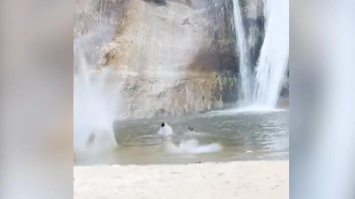 Die Lower Calf Creek Falls in Utah in den USA sind ein beliebtes Urlaubsziel - und lebensgefährlich. Denn immer wieder krachen hier Gesteinsbrocken in das Auffangbecken der Wasserfälle, wie nun auch zwei Schwimmer erfahren mussten.