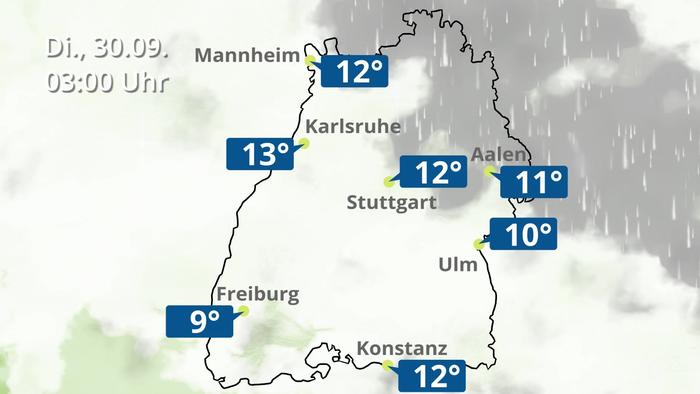 Wie ist das Wetter in Süddeutschland heute? Wie wird das Wetter im Schwarzwald morgen? Dieses Video zeigt den Regen- und Wolkenfilm für Baden-Württemberg für 36 Stunden. Mit dieser Vorschau können Sie sehen, wo es nach aktueller Wetterprognose regnen oder schneien wird, bzw. wo die Sonne scheint. Für die Städte Aalen, Freiburg, Karlsruhe, Konstanz, Mannheim, Stuttgart und Ulm werden die Temperaturen nach Prognose in Grad Celsius angezeigt. Daran können Sie erkennen, wie warm es in Baden-Württemberg am Tag, bzw. wie kalt es in der Nacht wird. Prognose vom 29. September 2025 um 18:10 Uhr