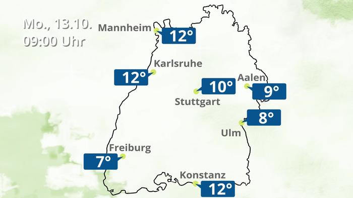 Wie ist das Wetter in Süddeutschland heute? Wie wird das Wetter im Schwarzwald morgen? Dieses Video zeigt den Regen- und Wolkenfilm für Baden-Württemberg für 36 Stunden. Mit dieser Vorschau können Sie sehen, wo es nach aktueller Wetterprognose regnen oder schneien wird, bzw. wo die Sonne scheint. Für die Städte Aalen, Freiburg, Karlsruhe, Konstanz, Mannheim, Stuttgart und Ulm werden die Temperaturen nach Prognose in Grad Celsius angezeigt. Daran können Sie erkennen, wie warm es in Baden-Württemberg am Tag, bzw. wie kalt es in der Nacht wird. Prognose vom 13. Oktober 2025 um 00:10 Uhr