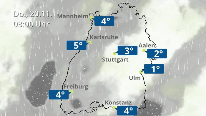 Wie ist das Wetter in Süddeutschland heute? Wie wird das Wetter im Schwarzwald morgen? Dieses Video zeigt den Regen- und Wolkenfilm für Baden-Württemberg für 36 Stunden. Mit dieser Vorschau können Sie sehen, wo es nach aktueller Wetterprognose regnen oder schneien wird, bzw. wo die Sonne scheint. Für die Städte Aalen, Freiburg, Karlsruhe, Konstanz, Mannheim, Stuttgart und Ulm werden die Temperaturen nach Prognose in Grad Celsius angezeigt. Daran können Sie erkennen, wie warm es in Baden-Württemberg am Tag, bzw. wie kalt es in der Nacht wird. Prognose vom 19. November 2025 um 18:10 Uhr