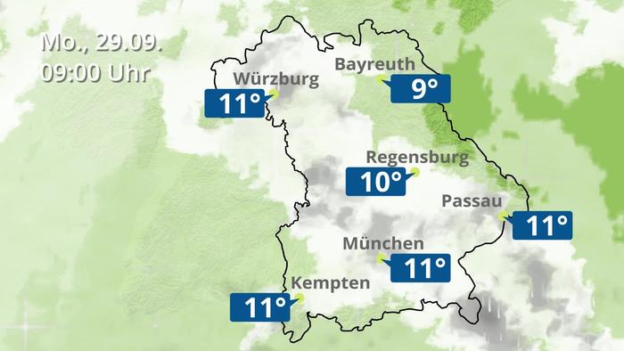Das Video zeigt die Wettervorhersage für Bayern: Wie warm wird es? Wo scheint die Sonne? Wie dicht ist die Bewölkung? Wann regnet es? Wo schneit es? Wolken und Niederschlag werden gemäß aktueller Wetterprognose als Animation dargestellt. Für die Städte München, Bayreuth, Kempten, Passau, Regensburg und Würzburg wird die Temperatur angezeigt. Prognose vom 29. September 2025 um 00:10 Uhr