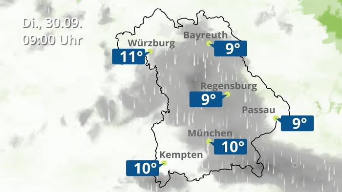 Das Video zeigt die Wettervorhersage für Bayern: Wie warm wird es? Wo scheint die Sonne? Wie dicht ist die Bewölkung? Wann regnet es? Wo schneit es? Wolken und Niederschlag werden gemäß aktueller Wetterprognose als Animation dargestellt. Für die Städte München, Bayreuth, Kempten, Passau, Regensburg und Würzburg wird die Temperatur angezeigt. Prognose vom 30. September 2025 um 00:10 Uhr