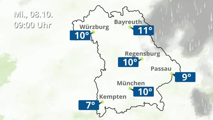 Das Video zeigt die Wettervorhersage für Bayern: Wie warm wird es? Wo scheint die Sonne? Wie dicht ist die Bewölkung? Wann regnet es? Wo schneit es? Wolken und Niederschlag werden gemäß aktueller Wetterprognose als Animation dargestellt. Für die Städte München, Bayreuth, Kempten, Passau, Regensburg und Würzburg wird die Temperatur angezeigt. Prognose vom 08. Oktober 2025 um 00:10 Uhr