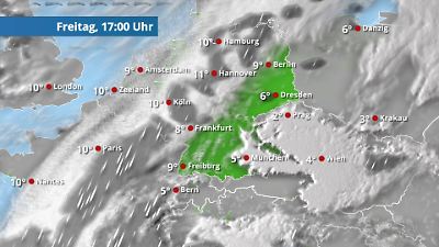 Wann regnet oder schneit es? Und wo regnet oder schneit es? Wie warm wird es? Diese Animation zeigt, wie Wolken, Schnee und Regen heute und morgen über Deutschland ziehen und wie hoch die Temperaturen dazu steigen oder wie tief sie sinken. Prognose vom 19. Dezember 2025 um 02:02 Uhr