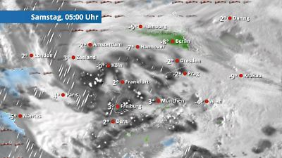 Wann regnet oder schneit es? Und wo regnet oder schneit es? Wie warm wird es? Diese Animation zeigt, wie Wolken, Schnee und Regen heute und morgen über Deutschland ziehen und wie hoch die Temperaturen dazu steigen oder wie tief sie sinken. Prognose vom 09. Januar 2026 um 02:02 Uhr