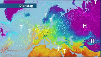 Ein Blick auf die Großwetterlage mit ihren großflächigen Luftströmungen hilft beim Verständnis des Wetterberichts. Wie ziehen die Tiefs, wie verlagern sich die Hochs? Und wie kräftig weht dazu der Wind? Die Entwicklung der Temperaturen in Deutschland und ganz Europa ist gut zu erkennen. Prognose vom 08. Dezember 2025 um 12:00 Uhr