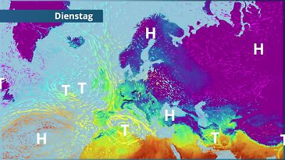 Ein Blick auf die Großwetterlage mit ihren großflächigen Luftströmungen hilft beim Verständnis des Wetterberichts. Wie ziehen die Tiefs, wie verlagern sich die Hochs? Und wie kräftig weht dazu der Wind? Die Entwicklung der Temperaturen in Deutschland und ganz Europa ist gut zu erkennen. Prognose vom 19. Januar 2026 um 12:00 Uhr