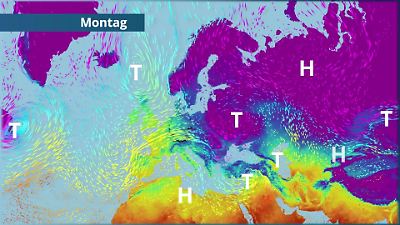 Ein Blick auf die Großwetterlage mit ihren großflächigen Luftströmungen hilft beim Verständnis des Wetterberichts. Wie ziehen die Tiefs, wie verlagern sich die Hochs? Und wie kräftig weht dazu der Wind? Die Entwicklung der Temperaturen in Deutschland und ganz Europa ist gut zu erkennen. Prognose vom 11. Januar 2026 um 12:00 Uhr