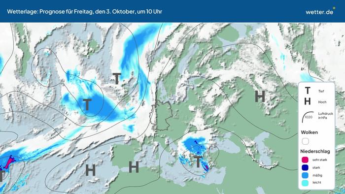 Wie wird sich die aktuelle Wetterlage in den nächsten Tagen entwickeln? Dieses Video zeigt eine Prognose für die Zugbahnen der Tiefdruckgebiete (Tiefs) und Hochdruckgebiete (Hochs) über dem Nordatlantik und Europa. Die Ausläufer der Tiefs können Wolken, Regen, Gewitter oder Schnee bringen. Ruhiges Wetter gibt es eher bei Hochdrucklagen. Besonders im Sommer kann es dann auch viel Sonnenschein geben. Die rundlichen Linien werden Isobaren genannt. Eine ausführliche Erläuterung der aktuellen Wetterlage findet sich in der Regel im aktuellen Wetterbericht von wetter.de. Dort werden oft auch die Namen der aktuellen Tiefs und Hochs vorgestellt. Prognose vom 02. Oktober 2025 um 03:00 Uhr