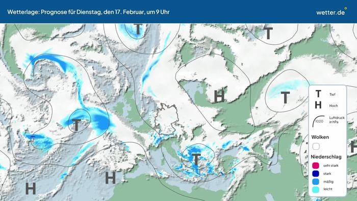 Wie wird sich die aktuelle Wetterlage in den nächsten Tagen entwickeln? Dieses Video zeigt eine Prognose für die Zugbahnen der Tiefdruckgebiete (Tiefs) und Hochdruckgebiete (Hochs) über dem Nordatlantik und Europa. Die Ausläufer der Tiefs können Wolken, Regen, Gewitter oder Schnee bringen. Ruhiges Wetter gibt es eher bei Hochdrucklagen. Besonders im Sommer kann es dann auch viel Sonnenschein geben. Die rundlichen Linien werden Isobaren genannt. Eine ausführliche Erläuterung der aktuellen Wetterlage findet sich in der Regel im aktuellen Wetterbericht von wetter.de. Dort werden oft auch die Namen der aktuellen Tiefs und Hochs vorgestellt. Prognose vom 16. Februar 2026 um 03:00 Uhr