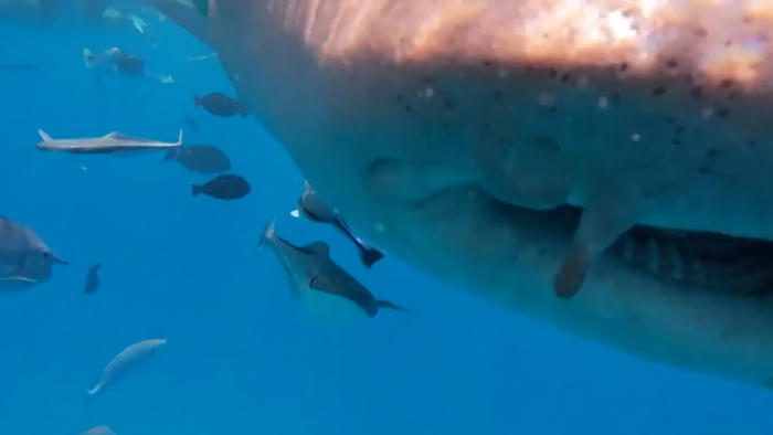 Ein Mann ist gerade auf den Malediven auf einem Tauchgang im Indischen Ozean. Er hat seine Kamera dabei und ist umzingelt von Haien. Plötzlich schwimmt einer der Raubfische direkt auf ihn zu, sein Maul weit geöffnet – im Video.