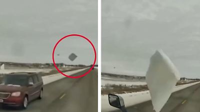 Als ein Lkw-Fahrer Highway 50 in der Nähe von Cedar Point im US-Bundesstaat Kansas unterwegs ist, löst sich Schnee vom Dach eines entgegenkommenden Autos. Nur wenige Sekunden später kracht eine Eisplatte auf die Windschutzscheibe des Kraftwagen-Fahrers. Zum Ausweichen ist keine Zeit mehr. Wie der Fahrer reagiert und wie es ihm heute geht, erfahrt ihr im Video.