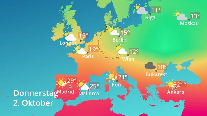 Wo gibt es schönes Wetter in Europa? Dieses Video zeigt die großflächige Temperaturverteilung in Europa als Prognose für einen Zeitraum von 10 Tagen. Hitzewellen und Kälteeinbrüche in Europa werden sichtbar und es zeigt sich, ob diese Deutschland erreichen, oder nicht. Wettersymbole und Temperaturen werden für die folgenden Städte dargestellt: Madrid (Spanien), Paris (Frankreich), London (England), Rom (Italien), Berlin (Deutschland), Wien (Österreich), Ankara (Türkei), Riga (Lettland) und Moskau (Russland). Somit vermittelt das Video einen Überblick über das Wetter in Europa für mehr als eine Woche, inklusive Wochenende. Prognose vom 30. September 2025 um 00:30 Uhr