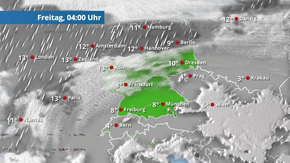 Ein Blick auf die Großwetterlage mit ihren großflächigen Luftströmungen hilft beim Verständnis des Wetterberichts. Wie ziehen die Tiefs, wie verlagern sich die Hochs? Und wie kräftig weht dazu der Wind? Die Entwicklung der Temperaturen in Deutschland und ganz Europa ist gut zu erkennen. Prognose vom 13. November 2025 um 12:00 Uhr