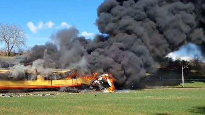 Ein Tanklaster ist in Ubstadt-Weiher nördlich von Karlsruhe mit einer Straßenbahn zusammengestoßen. Beide Fahrzeuge stehen nach Angaben der Polizei im Brand. Eine massive Rauchwolke steigt in die Luft. Ein Mensch sei mutmaßlich schwer verletzt, sagte eine Polizeisprecherin. Hinweise auf eine größere Zahl Verletzter oder gar Tote in Ubstadt-Weiher gab es ihren Angaben zufolge zunächst nicht.