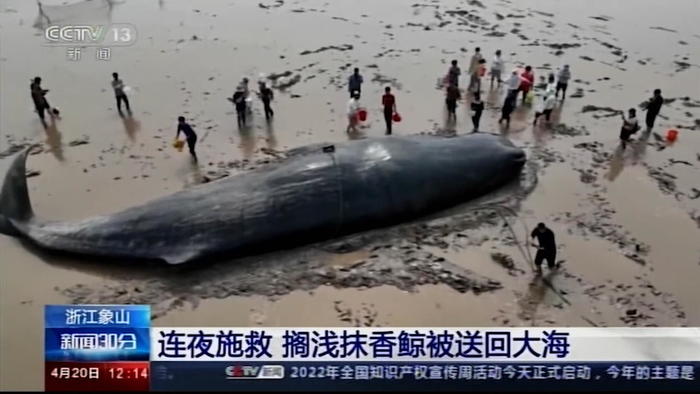 Am Morgen entdecken Fischer im Osten Chinas einen gestrandeten Pottwal. Aufnahmen zeigen wie Örtliche Behörden versuchen das Tier aus dem seichten Wasser zu ziehen. Doch vergeblich, der Wal ist zu groß. Als gegen Mittag die Flut zurückgeht liegt der Pottwal fast vollständig in der Sonne auf dem Schlammboden. Die Retter versuchen Alles um ihn vor dem Austrocknen zu bewahren und müssen auf die Flut warten. Erst am Abend steigt das Wasser wieder so hoch, dass der Wal schwimmen und wieder in die Tiefsee gebracht werden kann.