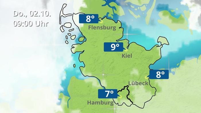 So wird das Wetter im Norden von Norddeutschland. Der Regen- und Wolkenfilm für Schleswig-Holstein und Hamburg, beziehungsweise für die Nordsee- und die Ostseeküste zeigt, wo es regnet. Für die Städte Hamburg, Kiel, Lübeck und Flensburg werden Prognosen für die Temperaturen angezeigt. Prognose vom 02. Oktober 2025 um 00:10 Uhr