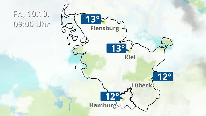 So wird das Wetter im Norden von Norddeutschland. Der Regen- und Wolkenfilm für Schleswig-Holstein und Hamburg, beziehungsweise für die Nordsee- und die Ostseeküste zeigt, wo es regnet. Für die Städte Hamburg, Kiel, Lübeck und Flensburg werden Prognosen für die Temperaturen angezeigt. Prognose vom 10. Oktober 2025 um 00:10 Uhr