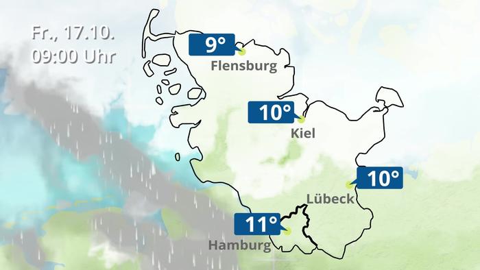 So wird das Wetter im Norden von Norddeutschland. Der Regen- und Wolkenfilm für Schleswig-Holstein und Hamburg, beziehungsweise für die Nordsee- und die Ostseeküste zeigt, wo es regnet. Für die Städte Hamburg, Kiel, Lübeck und Flensburg werden Prognosen für die Temperaturen angezeigt. Prognose vom 17. Oktober 2025 um 00:10 Uhr