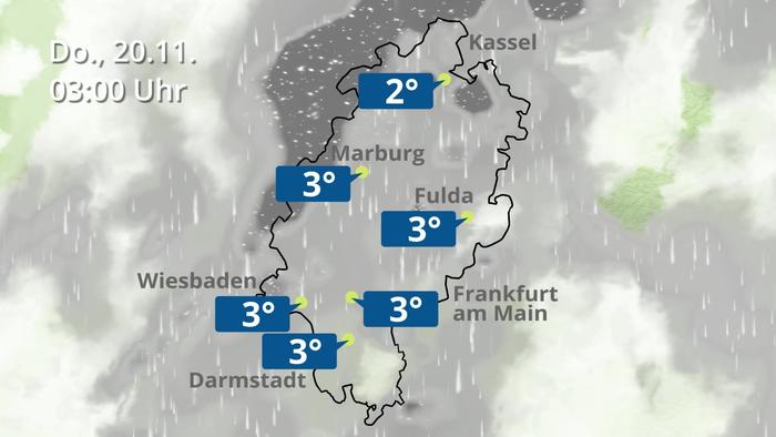 Diese Animation zeigt einen Wetterbericht für Hessen. Prognose vom 19. November 2025 um 18:10 Uhr
