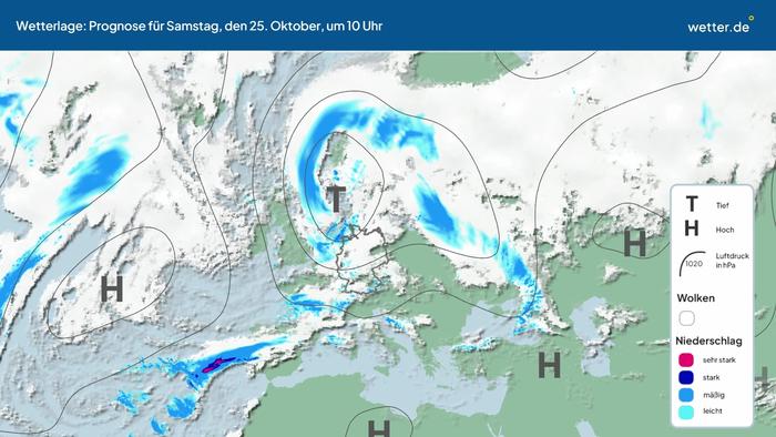 Wie wird sich die aktuelle Wetterlage in den nächsten Tagen entwickeln? Dieses Video zeigt eine Prognose für die Zugbahnen der Tiefdruckgebiete (Tiefs) und Hochdruckgebiete (Hochs) über dem Nordatlantik und Europa. Die Ausläufer der Tiefs können Wolken, Regen, Gewitter oder Schnee bringen. Ruhiges Wetter gibt es eher bei Hochdrucklagen. Besonders im Sommer kann es dann auch viel Sonnenschein geben. Die rundlichen Linien werden Isobaren genannt. Eine ausführliche Erläuterung der aktuellen Wetterlage findet sich in der Regel im aktuellen Wetterbericht von wetter.de. Dort werden oft auch die Namen der aktuellen Tiefs und Hochs vorgestellt. Prognose vom 24. Oktober 2025 um 03:00 Uhr