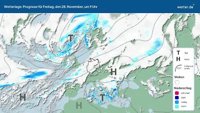 Wie wird sich die aktuelle Wetterlage in den nächsten Tagen entwickeln? Dieses Video zeigt eine Prognose für die Zugbahnen der Tiefdruckgebiete (Tiefs) und Hochdruckgebiete (Hochs) über dem Nordatlantik und Europa. Die Ausläufer der Tiefs können Wolken, Regen, Gewitter oder Schnee bringen. Ruhiges Wetter gibt es eher bei Hochdrucklagen. Besonders im Sommer kann es dann auch viel Sonnenschein geben. Die rundlichen Linien werden Isobaren genannt. Eine ausführliche Erläuterung der aktuellen Wetterlage findet sich in der Regel im aktuellen Wetterbericht von wetter.de. Dort werden oft auch die Namen der aktuellen Tiefs und Hochs vorgestellt. Prognose vom 27. November 2025 um 03:00 Uhr