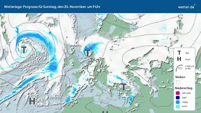 Wie wird sich die aktuelle Wetterlage in den nächsten Tagen entwickeln? Dieses Video zeigt eine Prognose für die Zugbahnen der Tiefdruckgebiete (Tiefs) und Hochdruckgebiete (Hochs) über dem Nordatlantik und Europa. Die Ausläufer der Tiefs können Wolken, Regen, Gewitter oder Schnee bringen. Ruhiges Wetter gibt es eher bei Hochdrucklagen. Besonders im Sommer kann es dann auch viel Sonnenschein geben. Die rundlichen Linien werden Isobaren genannt. Eine ausführliche Erläuterung der aktuellen Wetterlage findet sich in der Regel im aktuellen Wetterbericht von wetter.de. Dort werden oft auch die Namen der aktuellen Tiefs und Hochs vorgestellt. Prognose vom 29. November 2025 um 03:00 Uhr