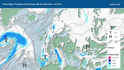 Wie wird sich die aktuelle Wetterlage in den nächsten Tagen entwickeln? Dieses Video zeigt eine Prognose für die Zugbahnen der Tiefdruckgebiete (Tiefs) und Hochdruckgebiete (Hochs) über dem Nordatlantik und Europa. Die Ausläufer der Tiefs können Wolken, Regen, Gewitter oder Schnee bringen. Ruhiges Wetter gibt es eher bei Hochdrucklagen. Besonders im Sommer kann es dann auch viel Sonnenschein geben. Die rundlichen Linien werden Isobaren genannt. Eine ausführliche Erläuterung der aktuellen Wetterlage findet sich in der Regel im aktuellen Wetterbericht von wetter.de. Dort werden oft auch die Namen der aktuellen Tiefs und Hochs vorgestellt. Prognose vom 15. Dezember 2025 um 03:00 Uhr