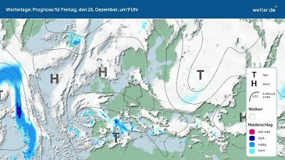 Wie wird sich die aktuelle Wetterlage in den nächsten Tagen entwickeln? Dieses Video zeigt eine Prognose für die Zugbahnen der Tiefdruckgebiete (Tiefs) und Hochdruckgebiete (Hochs) über dem Nordatlantik und Europa. Die Ausläufer der Tiefs können Wolken, Regen, Gewitter oder Schnee bringen. Ruhiges Wetter gibt es eher bei Hochdrucklagen. Besonders im Sommer kann es dann auch viel Sonnenschein geben. Die rundlichen Linien werden Isobaren genannt. Eine ausführliche Erläuterung der aktuellen Wetterlage findet sich in der Regel im aktuellen Wetterbericht von wetter.de. Dort werden oft auch die Namen der aktuellen Tiefs und Hochs vorgestellt. Prognose vom 25. Dezember 2025 um 03:00 Uhr