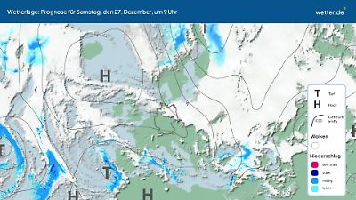 Wie wird sich die aktuelle Wetterlage in den nächsten Tagen entwickeln? Dieses Video zeigt eine Prognose für die Zugbahnen der Tiefdruckgebiete (Tiefs) und Hochdruckgebiete (Hochs) über dem Nordatlantik und Europa. Die Ausläufer der Tiefs können Wolken, Regen, Gewitter oder Schnee bringen. Ruhiges Wetter gibt es eher bei Hochdrucklagen. Besonders im Sommer kann es dann auch viel Sonnenschein geben. Die rundlichen Linien werden Isobaren genannt. Eine ausführliche Erläuterung der aktuellen Wetterlage findet sich in der Regel im aktuellen Wetterbericht von wetter.de. Dort werden oft auch die Namen der aktuellen Tiefs und Hochs vorgestellt. Prognose vom 26. Dezember 2025 um 03:00 Uhr