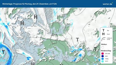 Wie wird sich die aktuelle Wetterlage in den nächsten Tagen entwickeln? Dieses Video zeigt eine Prognose für die Zugbahnen der Tiefdruckgebiete (Tiefs) und Hochdruckgebiete (Hochs) über dem Nordatlantik und Europa. Die Ausläufer der Tiefs können Wolken, Regen, Gewitter oder Schnee bringen. Ruhiges Wetter gibt es eher bei Hochdrucklagen. Besonders im Sommer kann es dann auch viel Sonnenschein geben. Die rundlichen Linien werden Isobaren genannt. Eine ausführliche Erläuterung der aktuellen Wetterlage findet sich in der Regel im aktuellen Wetterbericht von wetter.de. Dort werden oft auch die Namen der aktuellen Tiefs und Hochs vorgestellt. Prognose vom 28. Dezember 2025 um 03:00 Uhr