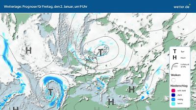Wie wird sich die aktuelle Wetterlage in den nächsten Tagen entwickeln? Dieses Video zeigt eine Prognose für die Zugbahnen der Tiefdruckgebiete (Tiefs) und Hochdruckgebiete (Hochs) über dem Nordatlantik und Europa. Die Ausläufer der Tiefs können Wolken, Regen, Gewitter oder Schnee bringen. Ruhiges Wetter gibt es eher bei Hochdrucklagen. Besonders im Sommer kann es dann auch viel Sonnenschein geben. Die rundlichen Linien werden Isobaren genannt. Eine ausführliche Erläuterung der aktuellen Wetterlage findet sich in der Regel im aktuellen Wetterbericht von wetter.de. Dort werden oft auch die Namen der aktuellen Tiefs und Hochs vorgestellt. Prognose vom 01. Januar 2026 um 03:00 Uhr