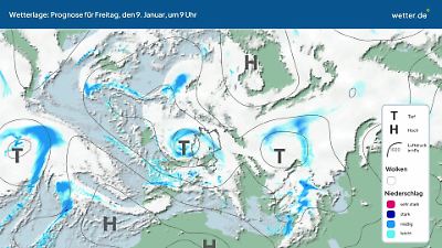 Wie wird sich die aktuelle Wetterlage in den nächsten Tagen entwickeln? Dieses Video zeigt eine Prognose für die Zugbahnen der Tiefdruckgebiete (Tiefs) und Hochdruckgebiete (Hochs) über dem Nordatlantik und Europa. Die Ausläufer der Tiefs können Wolken, Regen, Gewitter oder Schnee bringen. Ruhiges Wetter gibt es eher bei Hochdrucklagen. Besonders im Sommer kann es dann auch viel Sonnenschein geben. Die rundlichen Linien werden Isobaren genannt. Eine ausführliche Erläuterung der aktuellen Wetterlage findet sich in der Regel im aktuellen Wetterbericht von wetter.de. Dort werden oft auch die Namen der aktuellen Tiefs und Hochs vorgestellt. Prognose vom 08. Januar 2026 um 03:00 Uhr