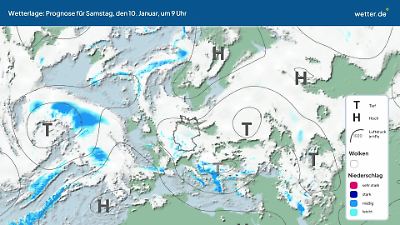 Wie wird sich die aktuelle Wetterlage in den nächsten Tagen entwickeln? Dieses Video zeigt eine Prognose für die Zugbahnen der Tiefdruckgebiete (Tiefs) und Hochdruckgebiete (Hochs) über dem Nordatlantik und Europa. Die Ausläufer der Tiefs können Wolken, Regen, Gewitter oder Schnee bringen. Ruhiges Wetter gibt es eher bei Hochdrucklagen. Besonders im Sommer kann es dann auch viel Sonnenschein geben. Die rundlichen Linien werden Isobaren genannt. Eine ausführliche Erläuterung der aktuellen Wetterlage findet sich in der Regel im aktuellen Wetterbericht von wetter.de. Dort werden oft auch die Namen der aktuellen Tiefs und Hochs vorgestellt. Prognose vom 09. Januar 2026 um 03:00 Uhr