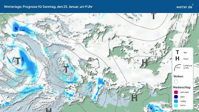 Wie wird sich die aktuelle Wetterlage in den nächsten Tagen entwickeln? Dieses Video zeigt eine Prognose für die Zugbahnen der Tiefdruckgebiete (Tiefs) und Hochdruckgebiete (Hochs) über dem Nordatlantik und Europa. Die Ausläufer der Tiefs können Wolken, Regen, Gewitter oder Schnee bringen. Ruhiges Wetter gibt es eher bei Hochdrucklagen. Besonders im Sommer kann es dann auch viel Sonnenschein geben. Die rundlichen Linien werden Isobaren genannt. Eine ausführliche Erläuterung der aktuellen Wetterlage findet sich in der Regel im aktuellen Wetterbericht von wetter.de. Dort werden oft auch die Namen der aktuellen Tiefs und Hochs vorgestellt. Prognose vom 24. Januar 2026 um 03:00 Uhr
