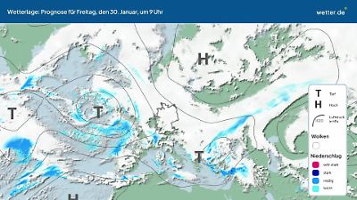 Wie wird sich die aktuelle Wetterlage in den nächsten Tagen entwickeln? Dieses Video zeigt eine Prognose für die Zugbahnen der Tiefdruckgebiete (Tiefs) und Hochdruckgebiete (Hochs) über dem Nordatlantik und Europa. Die Ausläufer der Tiefs können Wolken, Regen, Gewitter oder Schnee bringen. Ruhiges Wetter gibt es eher bei Hochdrucklagen. Besonders im Sommer kann es dann auch viel Sonnenschein geben. Die rundlichen Linien werden Isobaren genannt. Eine ausführliche Erläuterung der aktuellen Wetterlage findet sich in der Regel im aktuellen Wetterbericht von wetter.de. Dort werden oft auch die Namen der aktuellen Tiefs und Hochs vorgestellt. Prognose vom 29. Januar 2026 um 03:00 Uhr