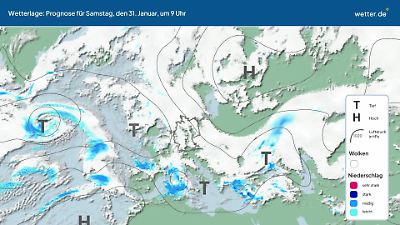 Wie wird sich die aktuelle Wetterlage in den nächsten Tagen entwickeln? Dieses Video zeigt eine Prognose für die Zugbahnen der Tiefdruckgebiete (Tiefs) und Hochdruckgebiete (Hochs) über dem Nordatlantik und Europa. Die Ausläufer der Tiefs können Wolken, Regen, Gewitter oder Schnee bringen. Ruhiges Wetter gibt es eher bei Hochdrucklagen. Besonders im Sommer kann es dann auch viel Sonnenschein geben. Die rundlichen Linien werden Isobaren genannt. Eine ausführliche Erläuterung der aktuellen Wetterlage findet sich in der Regel im aktuellen Wetterbericht von wetter.de. Dort werden oft auch die Namen der aktuellen Tiefs und Hochs vorgestellt. Prognose vom 30. Januar 2026 um 03:00 Uhr