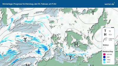 Wie wird sich die aktuelle Wetterlage in den nächsten Tagen entwickeln? Dieses Video zeigt eine Prognose für die Zugbahnen der Tiefdruckgebiete (Tiefs) und Hochdruckgebiete (Hochs) über dem Nordatlantik und Europa. Die Ausläufer der Tiefs können Wolken, Regen, Gewitter oder Schnee bringen. Ruhiges Wetter gibt es eher bei Hochdrucklagen. Besonders im Sommer kann es dann auch viel Sonnenschein geben. Die rundlichen Linien werden Isobaren genannt. Eine ausführliche Erläuterung der aktuellen Wetterlage findet sich in der Regel im aktuellen Wetterbericht von wetter.de. Dort werden oft auch die Namen der aktuellen Tiefs und Hochs vorgestellt. Prognose vom 09. Februar 2026 um 03:00 Uhr