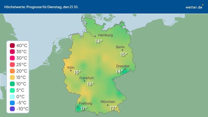 Wie warm oder kalt wird es am Wochenende? Wie sind die Temperaturen in der nächsten Woche? Wer das Wetter einschätzen will, möchte die Temperatur wissen. Dieses Video zeigt die Höchstwerte für die nächsten 14 Tage. Anhand der farblichen Markierung und der angegebenen Gradzahlen, können Sie abschätzen, wann und wo es in Deutschland wärmer oder kälter wird. Allerdings lässt die Prognosegenauigkeit mit der Zeit ab. Die Vorhersage für die nächsten Tage sollte recht gut passen, aber je weiter der Tag in der Zukunft liegt, desto unsicherer wird die Wetterprognose. Prognose vom 15. Oktober 2025 um 00:30 Uhr