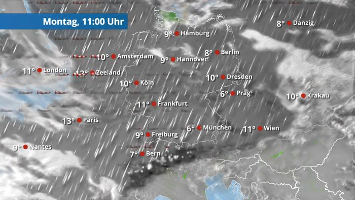Wann regnet oder schneit es? Und wo regnet oder schneit es? Wie warm wird es? Diese Animation zeigt, wie Wolken, Schnee und Regen heute und morgen über Deutschland ziehen und wie hoch die Temperaturen dazu steigen oder wie tief sie sinken. Prognose vom 27. Oktober 2025 um 02:02 Uhr