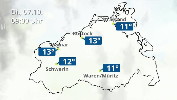 Wie ist das Wetter an der Ostsee heute? Wie wird das Wetter in Mecklenburg-Vorpommern (MVP) morgen? Unser Regen- und Wolkenfilm zeigt die Prognose für Wolken, Regen und ggfs. Schnee für 36 Stunden. Für die Städte Rostock, Schwerin, Stralsund, Waren und Wismar werden die Temperaturen angezeigt. Daran können Sie erkennen, wie warm es am Tag, bzw. wie kalt es in der Nacht wird. Wenn Sie Urlaub an der Ostsee machen und sich für das Wetter am Strand interessieren, können Sie mit dieser Vorschau sehen, wo es an der Küste nach Prognose trocken bleibt und ob die Sonne von Wolken verdeckt wird. Prognose vom 07. Oktober 2025 um 00:10 Uhr