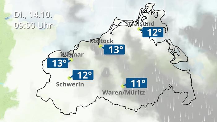 Wie ist das Wetter an der Ostsee heute? Wie wird das Wetter in Mecklenburg-Vorpommern (MVP) morgen? Unser Regen- und Wolkenfilm zeigt die Prognose für Wolken, Regen und ggfs. Schnee für 36 Stunden. Für die Städte Rostock, Schwerin, Stralsund, Waren und Wismar werden die Temperaturen angezeigt. Daran können Sie erkennen, wie warm es am Tag, bzw. wie kalt es in der Nacht wird. Wenn Sie Urlaub an der Ostsee machen und sich für das Wetter am Strand interessieren, können Sie mit dieser Vorschau sehen, wo es an der Küste nach Prognose trocken bleibt und ob die Sonne von Wolken verdeckt wird. Prognose vom 14. Oktober 2025 um 00:10 Uhr